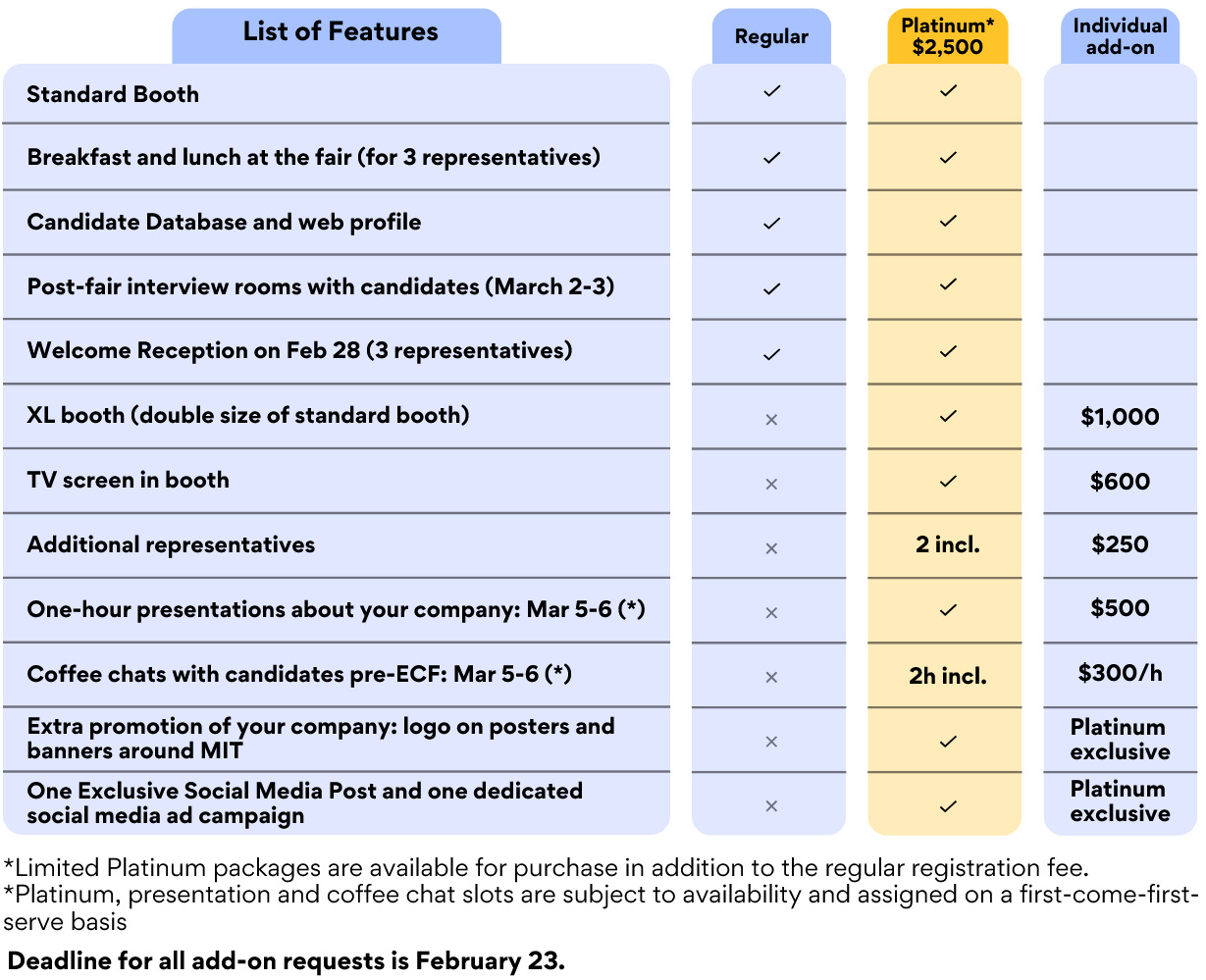 After selecting the basic registration fee, you will be able to select Add-on options. You can choose individual Add-ons, or get the Platinum package which offers the best selection of Add-ons and includes exclusive enhanced visibility opportunities via dedicated social media posts and other perks. Platinum packages, presentations, and coffee chats are limited and on a first-come-first-serve basis.