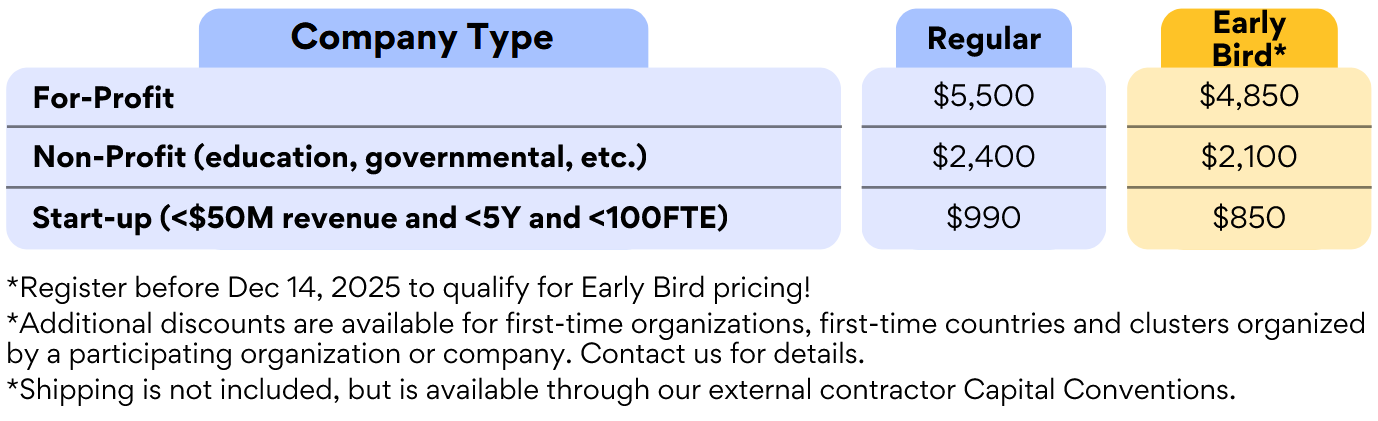 The basic registration price is indicated in the following table for the different company types. Access the Early Bird prices by registering before December 14th, 2025!